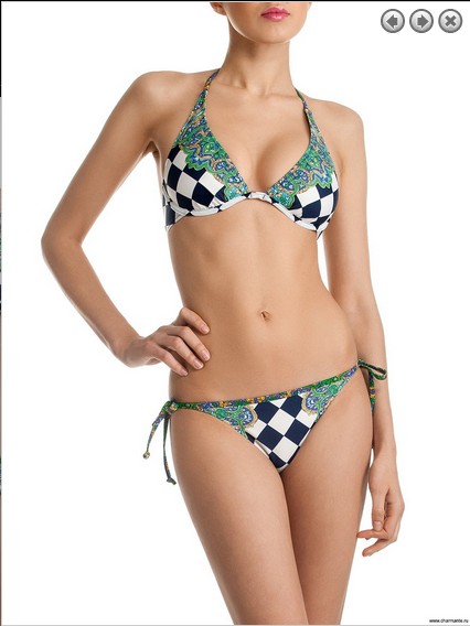 Молодёжная пляжная двойка. Бюст - мягкие чашечки на каркасной поддержке с лёгкой драпировкой под грудью с выходом на тонкие завязки на шею и спину. Под подкладкой бюста расположены дублированные вкладыши плавающего типа, которые при необходимости легко удаляются через специальные отверстия. Плавки-бикини комфортной посадки на тонких завязках, которые позволяют регулировать объём. Стильный купальник выполнен в актуальном тренде 'Домино' в комбинации с оригинальным восточным орнаментом в зелёных тонах.