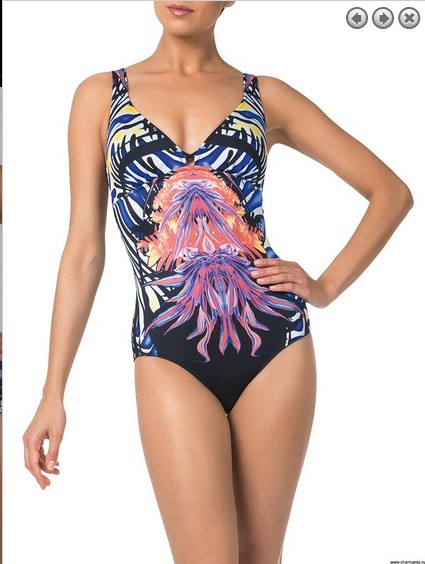 Роскошный слитный купальник из блестящей лайкры от Carvico. Тюльпанообразное декольте из двух мягких вместительных треугольников на широких бретелях. Изысканная скульптурная форма, усиленная правильным анатомическим кроем и утягивающей сеткой Power net. Интересная модель выполнена в синтезированном рисунке яркой абстракции с принтом детального расположения.