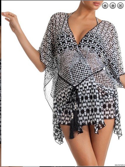 Стильная туника распашного типа, свободного кроя из эластичной сетки с обработкой тонкой силиконовой лентой по срезам. Оригинальный шнурок с шелковистыми кистями фиксируется на талии через узкие прорези. Эффектный принт выполнен в духе актуальных тенденций стиля 'Пье-де-пуль' в классическом чёрно-белом варианте.