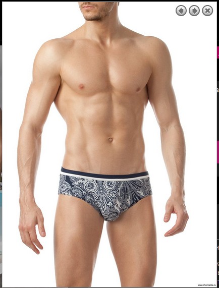 Стильные мужские плавки классической посадки со средним бочком, контрастным отрезным поясом с белым кантом и потайным шнуром для регулировки посадки на теле. Элегантный принт 'Пейсли' в сдержанных сине-белых тонах подчёркивает мужественность модели.