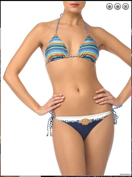 Популярный купальник - бикини. Бюст - подвижные треугольники с плавающими чашечками внутри конструкции. Маленькие плавки комфортной посадки. Весь купальник фиксируется на оригинальных кручёных завязках "Морской канатик" с золотыми фирменными наконечниками.