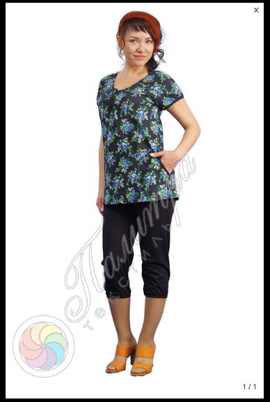 Прекрасный женственный костюм из лёгкого трикотажного полотна, состоит из короткой туники цветочной расцветки и облегающих бридж на широкой эластичной резинке.