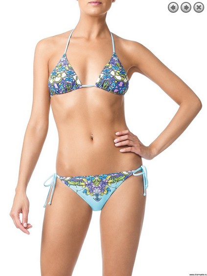 Оригинальный мини-бикини. Бюст - мягкие подвижные треугольники с плавающими чашечками внутри, на тонких завязках. Плавки заниженной посадки на завязках для удобной регулировки модели на теле. Купальник выполнен в сложной технике поместного расположения принта в свежей цветовой гамме "Венок фиалок".