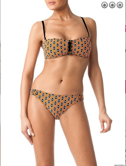 Новинка сезона! Элегантный купальник из двух предметов. Модный бюст-бандо со съёмными регулируемыми бретелями и застёжкой на спине украшен эффектной золотой шнурованной пряжкой. Плавки комфортной посадки с золотыми подвижными пряжками по бокам. Оригинальный графический принт в ярких контрастных тонах в сочетании с матовой микрофиброй отлично дополняет стилистику модели, поддерживая коллекционный ряд.