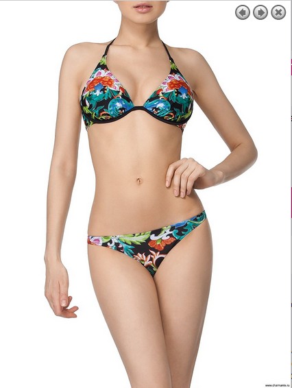 Оригинальный молодёжный купальник из двух предметов. Бюст - мягкие треугольные чашечки на каркасной поддержке, со съёмными корректорами внутри. Бюст фиксируется на теле тонкими плоскими завязками. Плавки заниженной посадки с узким бочком. Эксклюзивный принт в стиле японских росписей строгого детального расположения завершает яркий дизайн модели.