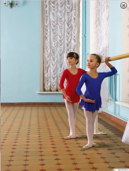 Стильный спортивный купальник для девочек с круглым вырезом горловины, рукавами длины 3/4 и юбкой из полупрозрачной сетки по линии бёдер. Модель украшена изящными принтами.