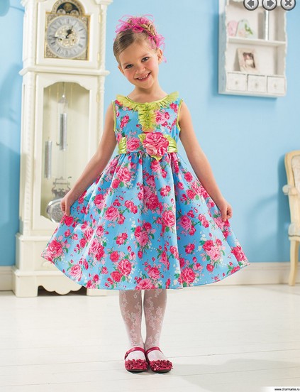 Прекрасное праздничное платье из коллекции <<Воскресный пикник>> в кантри-стиле. Лиф маечного типа с круглым вырезом по горловине. На спинке застегивается на молнию. Пышная юбка с подъюбником из сетки длиной 3/4. Атласное платье небесно-голубого цвета с ярким принтом <<Букетики роз>> и салатовой отделкой. Горловина и пройма оформлены атласным салатовым кантом. По верху расположена оборка и жабо из органзы. По талии платье фиксируется салатовой широкой лентой-поясом, который декорирован букетом из розовых бутонов.