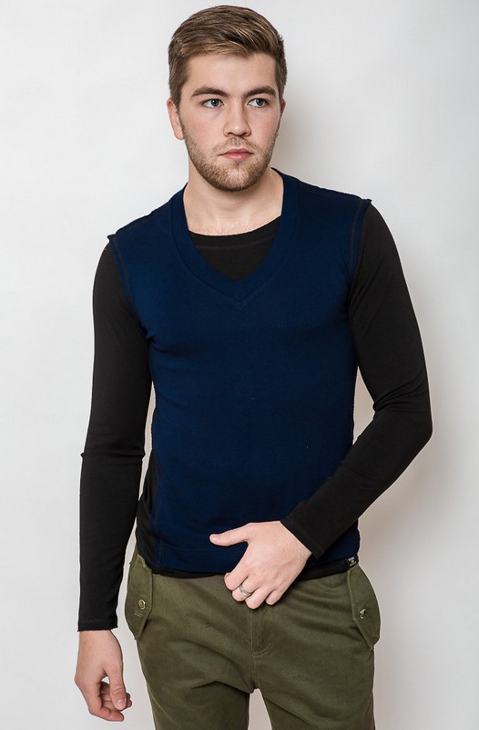 Двухцветный трикотажный свитер спереди выглядит как комплект-двойка: жилет с вырезом <<уголком>> и одетый под него, контрастный джемпер. Свитер, длиной чуть ниже талии, выгодно подчеркивает фигуру, обеспечивая абсолютное облегание.