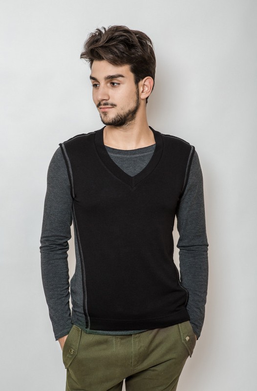 Двухцветный трикотажный свитер спереди выглядит как комплект-двойка: жилет с вырезом <<уголком>> и одетый под него, контрастный джемпер. Свитер, длиной чуть ниже талии, выгодно подчеркивает фигуру, обеспечивая абсолютное облегание.