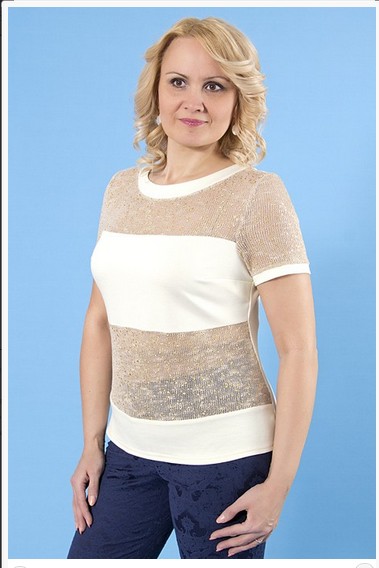 Описание модели: Блуза трикотажная комбинированная. Полосы из однотонного джерси и вязаного трикотажа с золотистым принтом. Рукав короткий. Длина по спинке от плечевого шва ок. 60 см.
