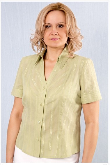 Описание модели: Блузка хлопковая, рукав короткий, воротник рубашечный, вставка горловины по косой. На фото с юбкой 169-302.