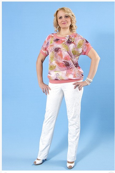 Описание модели: Блузка шифоновая комбинированная. Цельнокроеный короткий рукав. Планки горловины, манжеты рукавов и низа из трикотажа в резинку. Брошь-цветок декорирована бусинами, пришитыми вручную. Длина по спинке от плечевого шва ок 64 см.