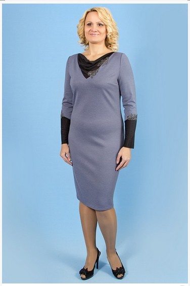Описание модели: Платье трикотажное. Воротник качели и манжеты рукавов из сетки. Декоративные аппликации серебристого цвета на переде и рукавах. Рукав длинный.