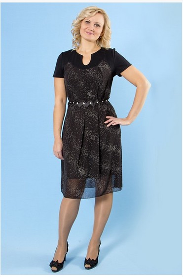 Описание модели: Платье комбинированное. Фигурные кокетки и рукава из трикотажа, основа из шифона на чехле из сетки стрейч. Пояс из декоративной тесьмы завязывается на спинке.