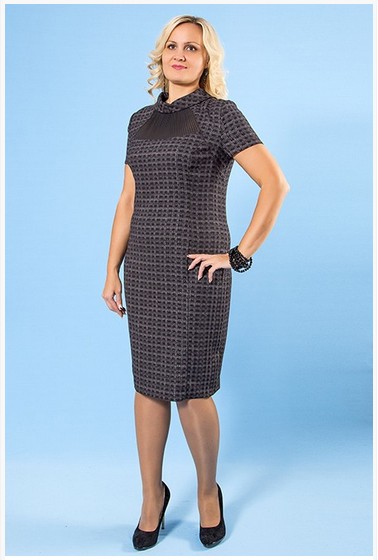 Описание модели: Платье футляр из костюмной ткани в мелкую клетку. Вставка на переде из гофрированного шифона. Короткий рукав. Застежка молния в среднем шве спинки.