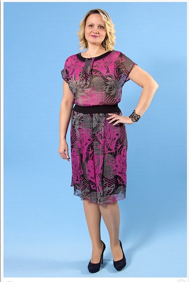 Описание модели: Платье приталенного силуэта, комбинированное. Основа из набивного шифона, отделочные планки из однотонного джерси. Горловина декорирована бусинами, пришитыми вручную. Юбка платья на подкладке из сетки стрейч. Длина по спинке от плечевого шва ок. 105 см.