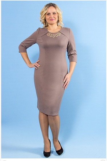 Описание модели: Платье из однотонного джерси. Вырез горловины декорирован металлическим элементом, пришитым вручную. Рукав 3/4. Длина по спинке от плечевого шва ок 104 см.