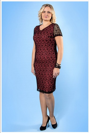 Описание модели: Платье из эластичного кружева на контрастном трикотажном чехле, короткий рукав. Бижутерия в комплект не входит. Длина по спинке от плечевого шва ок 104 см.