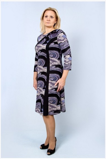 Описание модели: Платье трикотажное полуприлегающего силуэта, юбка годе, рукав 3/4, контрастные вставки на переде у горловины декорированы крупными стразами