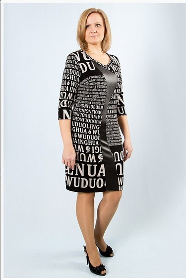 Описание модели: Платье из трикотажа с купонным рисунком, рукав 3/4, на переде фигурная вставка из ткани, имитирующей кожу.