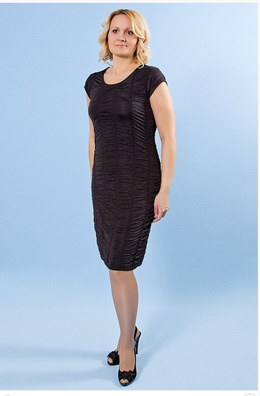 Описание модели: Платье трикотажное прилегающего силуэта, из ткани с декоративной драпировкой, короткий рукав.