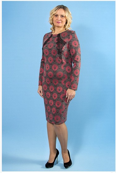 Описание модели: Платье трикотажное. Фигурные рельефные швы на переде подчеркнуты кружевными вставками. Рукав длинный. Длина по спинке от плечевого шва ок 104 см.