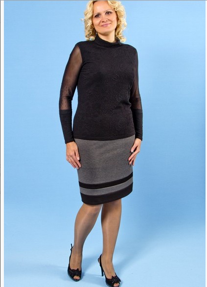 Описание модели: Юбка карандаш трикотажная, длина ок 59 см. Кокетка и вставки по низу из контрастного трикотажа. Верх на обтачке, подкладка сетка стрейч.