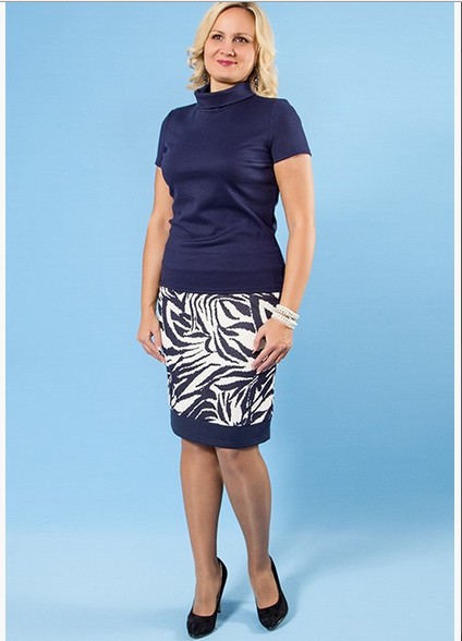 Описание модели: Юбка прямая трикотажная. Кайма низа из однотонного трикотажа. Верх на обтачке, подкладка сетка стрейч. Длина ок 60 см. На фото с жакетом 601-612.