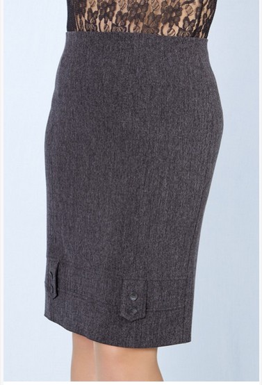 Описание модели: Юбка прямая, длина ок. 60 см, по низу вставка с хлястиками и пуговицами, ткань - стрейч