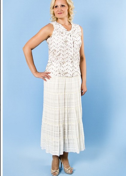 Описание модели: Юбка расширенная из марлевки молочного цвета, длина ок. 90 см, с пятью оборками ярусами. На подкладке.