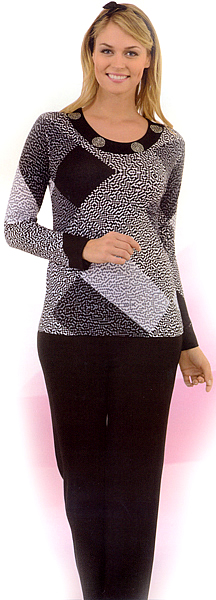 Комплект - майка с брюками, может использоваться как костюм для дома и отдыха. Майка с длинным рукавом, на груди круглый вырез, украшен паетками. Брюки на резинке, в пояс вставлена кулиска.