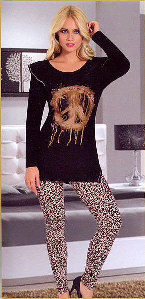 Комплект - майка с брюками, может использоваться как костюм для дома и отдыха. Майка с длинным рукавом, на плечах крылышки, а по боковым швам внизу разрезы. Брюки на широкой резинке.