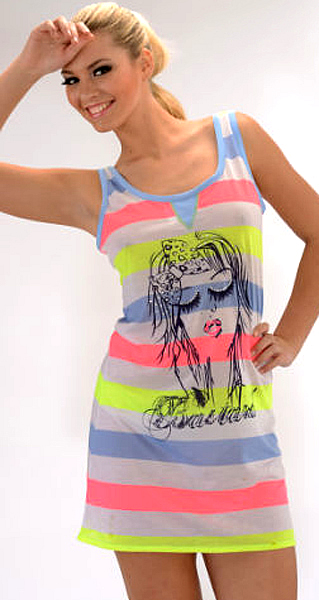 Туника на широких брителях. На груди рисунок, украшенный паетками. На спинке глубокий вырез задрапированный перекрещивающимися полосками. Длина туники выше колена, может использоваться как одежда для дома и отдыха.