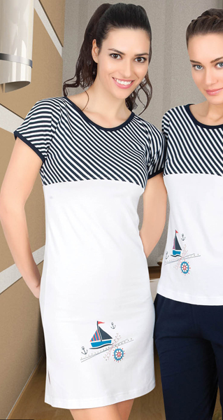 Туника с коротким рукавом-кимоно, по бокам разрезы. Спереди туники, в нижней части рисунок на морскую тему, украшенный маленькими золотистыми заклёпками. Верх майки до линии груди и рукавчики - из ткани в косую полоску. Длина туники выше колена.