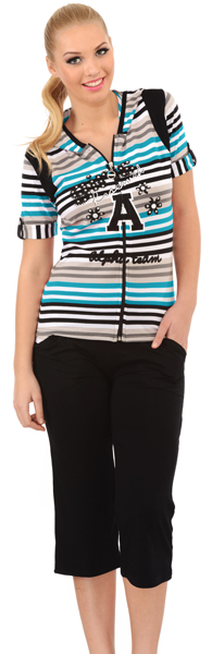 Комплект - майка с бриджами, может использоваться как костюм для дома и отдыха. Майка с капюшоном и коротким рукавом, на груди застёжка-молния, которая расстёгивается до конца, с переди рисунок, украшенный паетками. Бриджи на резинке, в пояс выставлена кулиска, по бокам карманы.