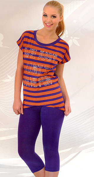 Комплект - майка с бриджами, может использоваться как костюм для дома и отдыха. Майка со спущенным плечом, на груди рисунок, украшенный паетками. Полоски только спереди. Спинка из такой же ткани, как и бриджи. Майка имеет асимметричную длину (спереди короче, а сзади длиннее). Бриджи на резинке.