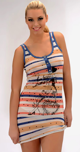 Туника на широких брителях. На груди застёжка в виде планки с пуговицами. Спереди туники рисунок, украшенный паетками. На спинке глубокий вырез. Длина туники выше колена, может использоваться как одежда для дома и отдыха.