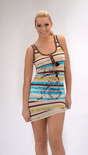 Туника на широких брителях. На груди застёжка в виде планки с пуговицами. Спереди туники рисунок, украшенный паетками. На спинке глубокий вырез. Длина туники выше колена, может использоваться как одежда для дома и отдыха.