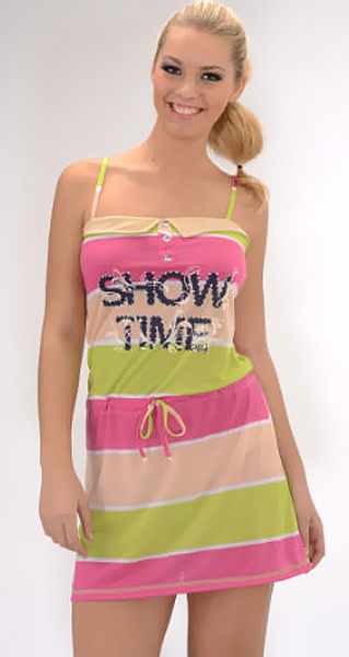Туника на широких брителях. На груди - планка с пуговицами, имитирующая застёжку и рисунок, украшенный паетками. На спинке глубокий вырез. Длина туники выше колена, чуть ниже линии талии вставлена кулиска. Туника может использоваться как одежда для дома и отдыха.