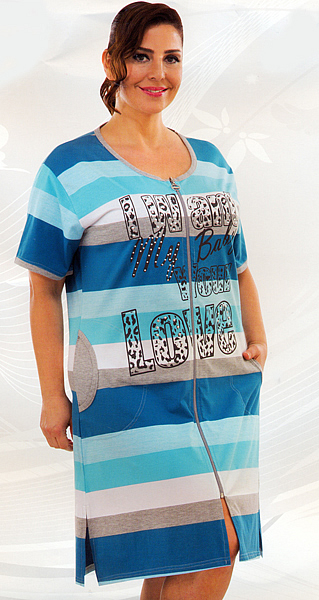 Туника с коротким рукавом. Длина туники до колена или чуть выше; по бокам разрезы. Спереди застёжка-молния выгодно превращает тунику в халатик. По бокам вшивные карманы. На груди рисунок, украшенный заклёпками. Туника может использоваться как одежда для дома и отдыха.