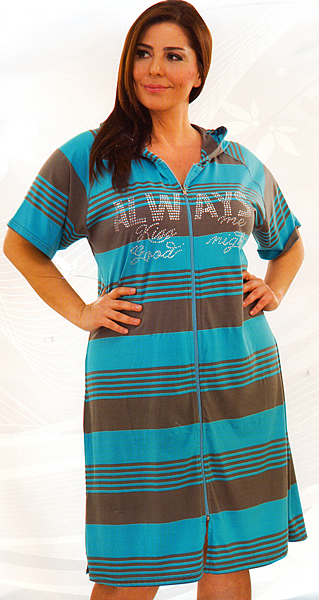 Туника с коротким рукавом-реглан, с капюшоном. Длина туники до колена или чуть выше; по бокам разрезы. Спереди застёжка-молния выгодно превращает тунику в халатик. На груди рисунок, украшенный паетками. Туника может использоваться как одежда для дома и отдыха.