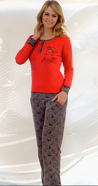 Комплект - майка с брюками, может использоваться как костюм для дома и отдыха. Майка с длинным рукавом, на груди планка с пуговицами. Рисунок на майке украшен паетками. Брюки на резинке, по бокам карманы.