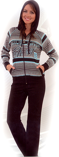 Комплект - кофта с брюками, может использоваться как костюм для дома и отдыха. Кофта с длинным рукавом, с капюшоном, с карманами и застёжкой молнией. Надписи на груди кофты украшены заклёпками. Брюки на резинке, по бокам карманы, в пояс вставлена кулиска. Ткань брюк более толстая (имеет двойной слой).
