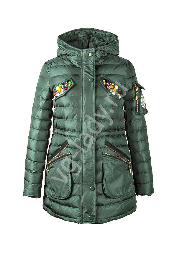 Парка на синтепоне с капюшоном, на карманах украшена разноцветными камнями, материал - плащевка. По талии затягивается внутренним шнурком.