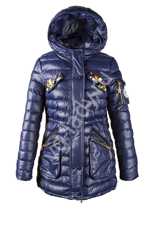 Парка на синтепоне с капюшоном, на карманах украшена разноцветными камнями, материал - плащевка. По талии затягивается внутренним шнурком.