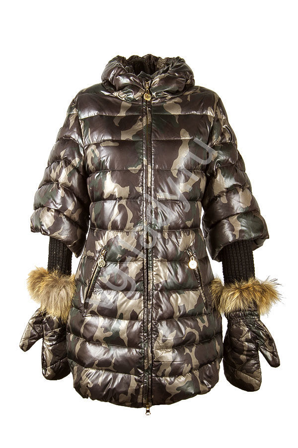 Полупальто милитари с капюшоном, наполнитель пух, рукав 3/4, отдельно вязанные рукава с варежками. Длина 83 см.
