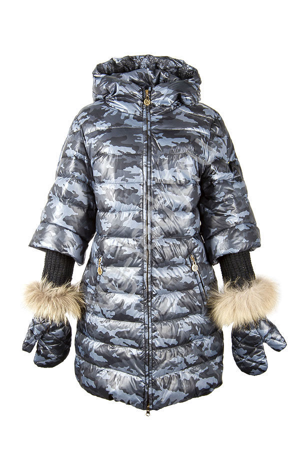 Полупальто милитари с капюшоном, наполнитель пух, рукав 3/4, отдельно вязанные рукава с варежками. Длина 83 см.