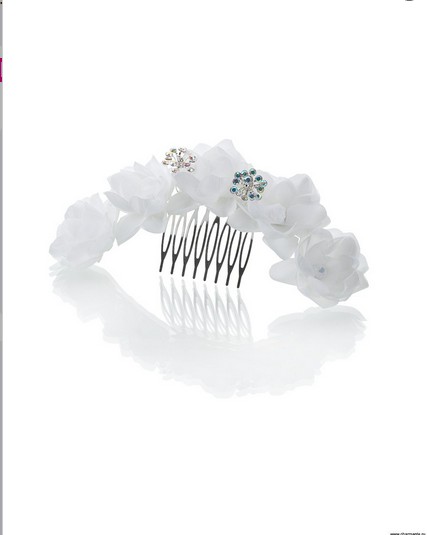 Очаровательный гребень для девочек на металлическом каркасе. Центральный элемент -цветочная композиция, выполненная в комбинации материалов из атласа и фатина цвета айвори. Изделие дополнено металлическими веточками и мерцающими стразами. Такой аксессуар прекрасно подчеркнет торжество момента.