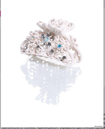 Заколка-краб прекрасно дополнит праздничный и повседневный образы. Модель изготовлена из качественного металла с покрытием цвета. Краб, фиксирующий прическу, оформлен в виде крыльев бабочки. Изделие выполнено в технике , украшено цветочным орнаментом и россыпью стразов.