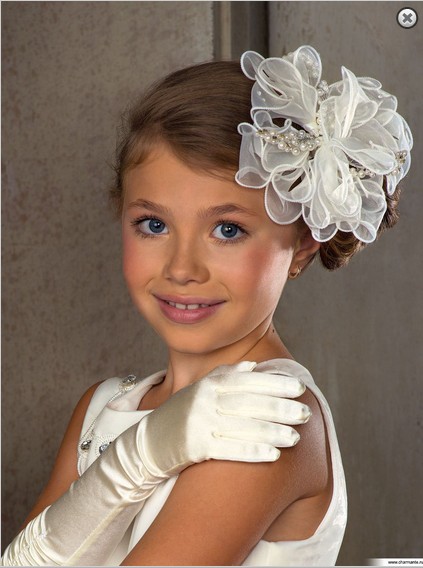 Миниатюрная заколка-зажим, украшенная бантом из органзы с вкраплениями страз. Композицию дополняют металлические веточки, унизанные белыми жемчужинами и мерцающими стразами.